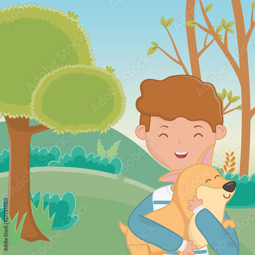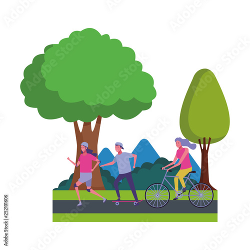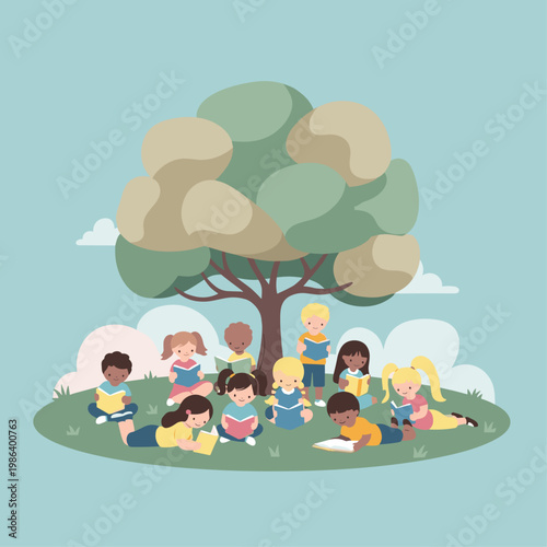 Vector illustration of young girl using laptop while lying on green grass in city park. Flat style design.