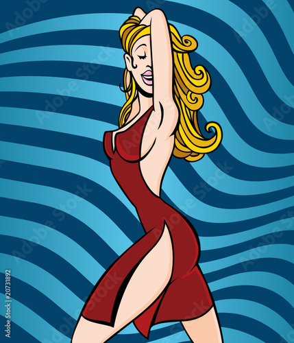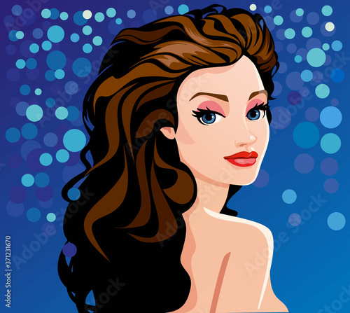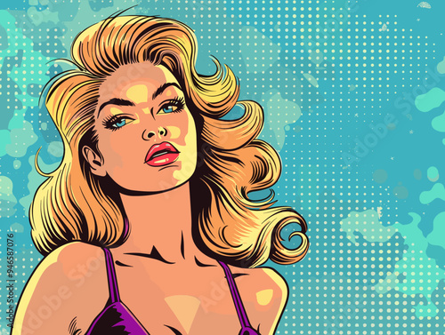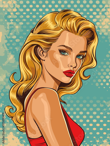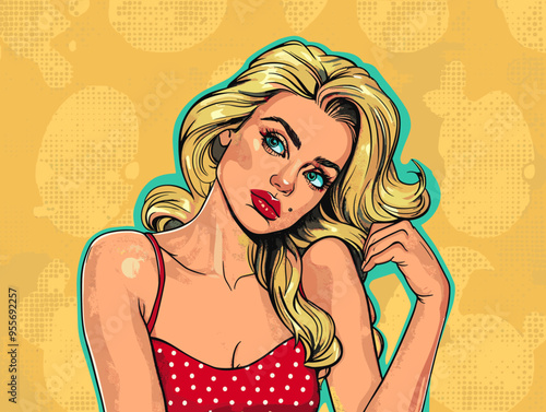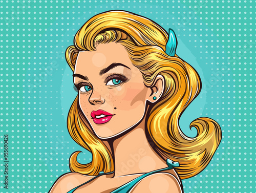 Vector illustration of beautiful sexy pin up girl with long hair. Glamour woman portrait in retro pop art comic style.