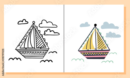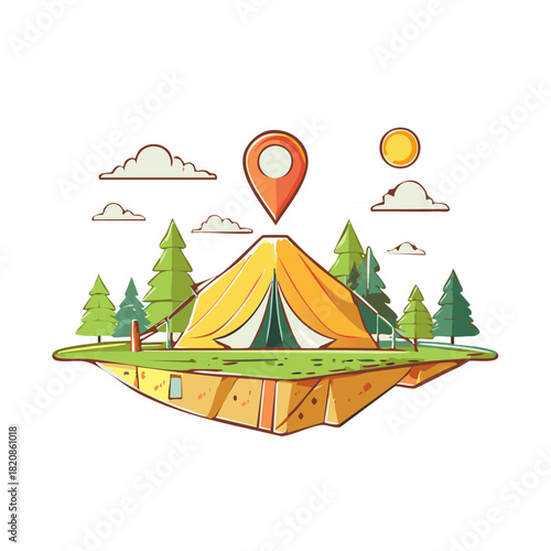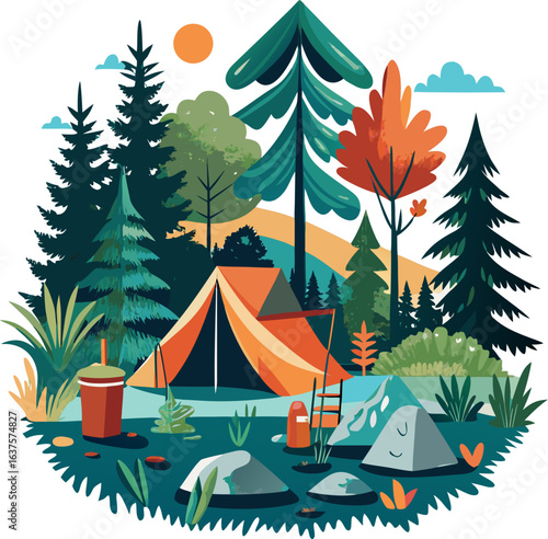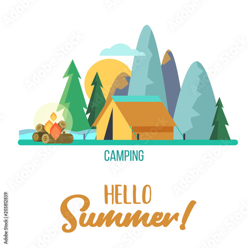 Glamping advertising. Eco camp vector poster. Modern yurt camping nestled in forest and mountains. Travel, rest and adventure on nature concept. Tent house, bonfire over natural landscape