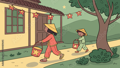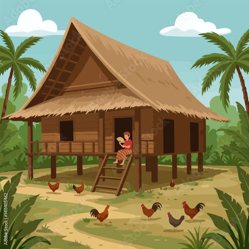 Glamping and camping in nature, vector poster with A-frame house. Luxury aframe house for recreation outdoors. Travel ourdoor and adventure concept.