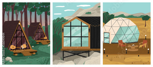 Glamping and camping in nature, vector posters set. Luxury a-frame house, glass and bubble houses for recreation outdoors. Travel ourdoor and adventure concept.