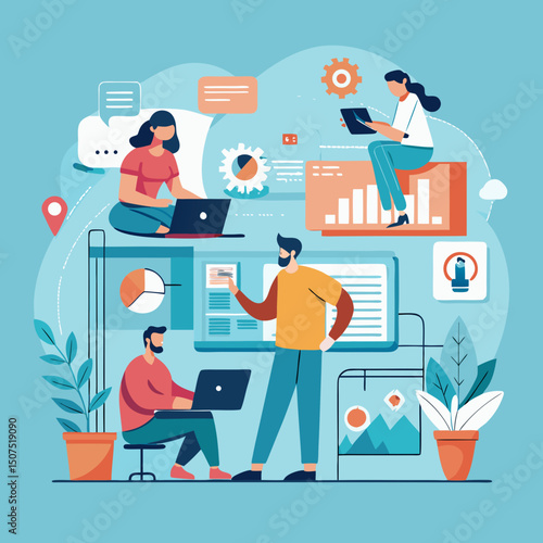 GMO testing lab. Scientists conducting gmo test, experiment with apple, avocado fruits, flat vector illustration. Bioengineered food, genetically modified products.