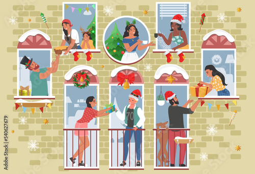 Good neighbors communicating with each other from open windows and balconies, flat vector illustration. Happy people talking, drinking tea, coffee, sharing pie, book with neighbors. Good neighborhood.