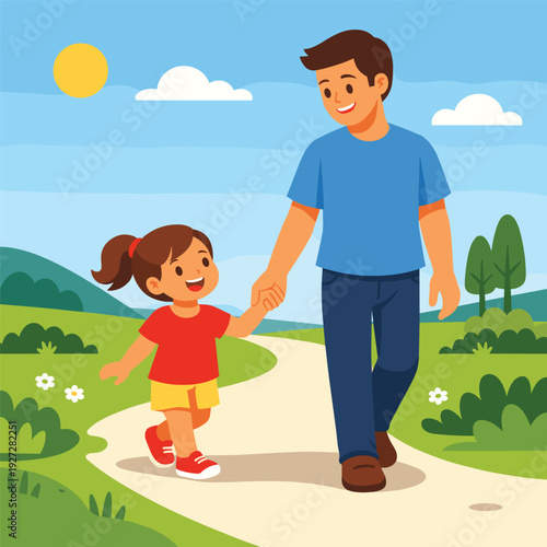 Happy grandfather walking with granddaughter, feeding doves in the park, flat vector illustration. Grandpa and grandkid spending time together. Grandparent grandchild relationships.