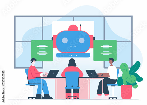 Business people making deal using tablet and desktop computer, vector flat illustration. Digital business agreement, great deal, online communication, thumb up hand sign for approval.