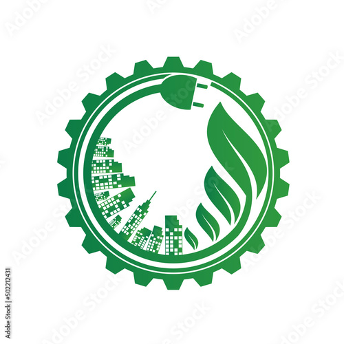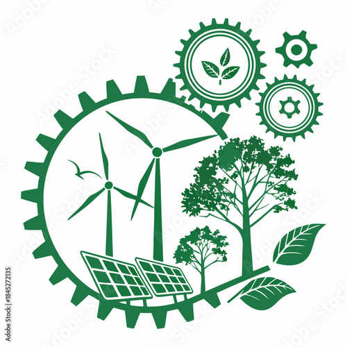 Green energy logo. Paper cut windmills and solar panels in circle with green and white leaves. Vector illustration in paper art style. Save environment, alternative energy, ecology concept.