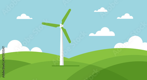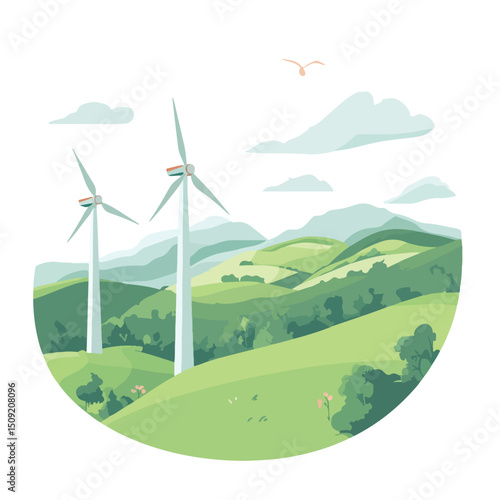 Green hills nature landscape, vector illustration in paper art style. Summer rural scene with beautiful hills, field, meadows, trees, windmills, sky, clouds, sun. Countryside nature scenery.