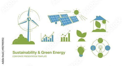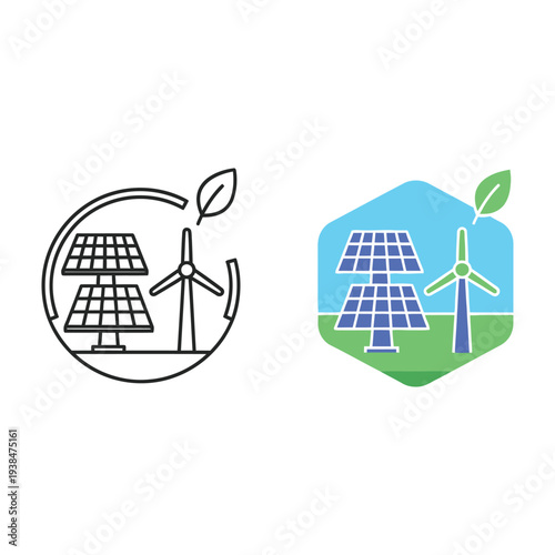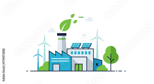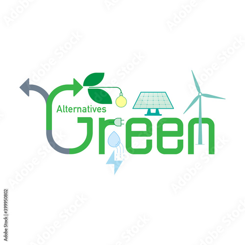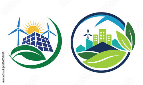 Green leaf with windmills and solar panels, trees, city building silhouettes, vector illustration in paper art style. Save environment, ecology. Green energy concept.
