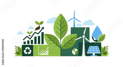Green leaf with windmills and solar panels, trees, city building silhouettes, vector illustration in paper art style. Save environment, ecology. Green energy concept.