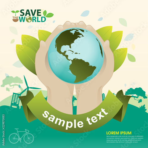 Green recycling sign and planet Earth globe, vector illustration in paper art craft style. Waste reuse and recycle symbol, label. World Environment Day. Save planet.