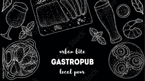 Grill pan brand ads poster banner template. Vector realistic top view grill pan and ink hand drawn barbeque food meat, spices, herbs.