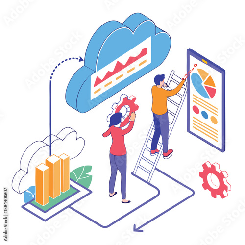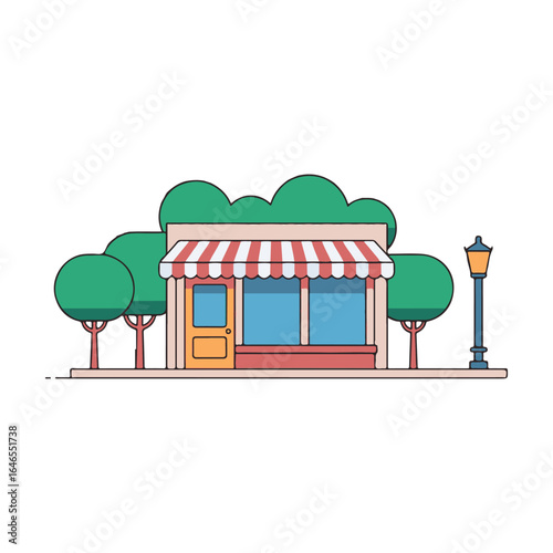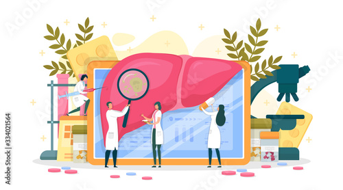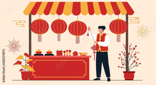 Grocery shop with seller cashier male and shopper female buying apples, vector flat style design illustration. Grocery store, supermarket.