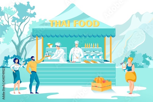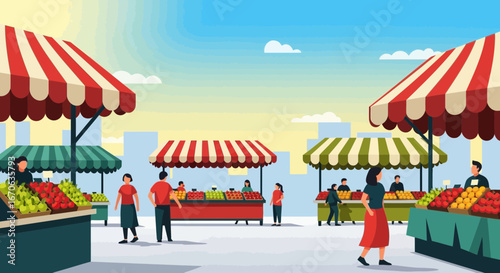 Grocery shop with seller cashier male and shopper female buying apples, vector flat style design illustration. Grocery store, supermarket.
