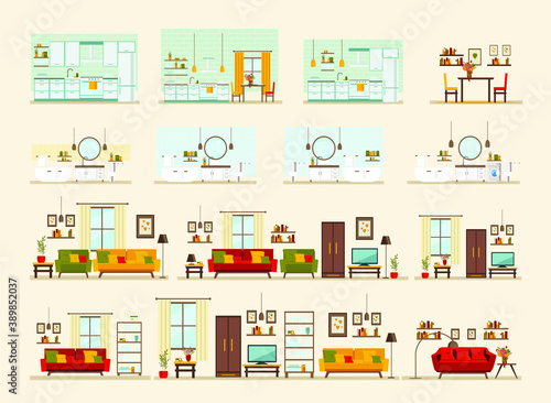 Vector set of posters with supermarket interior with cash boxes, shelves full of fruits, vegetables, drinks, meat, fish and dairy products. Living room interior. Purchases concept flat style design.