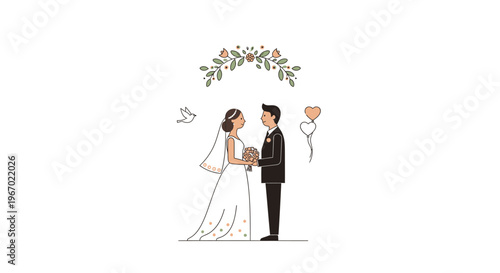 Groom and bride wearing ceremonial dress and suit standing at floral arch for memory vibes photoset vector illustration. Wedding ceremony, marriage party celebration concept