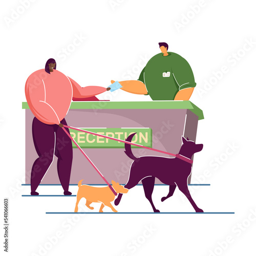 Grooming pet master caring dogs cutting fur with scissors vector illustration scene set. Professional salon service for domestic animals