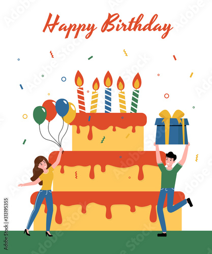Group of business people celebrating happy birthday, vector flat illustration. Birthday party with friends, colleagues and big cake with candles, gifts.