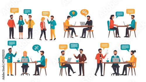 Group of science people vector icon set. Scientists giving lecture, laboratory workers carrying out scientific experiments, medical tests while using lab equipment and glassware. Flat style design.