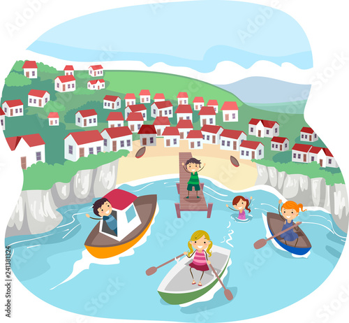 Group of tourist enjoying yacht cruise nearby tropical seaside vector illustration. Happy young people, friends team having fun, swimming, sunbathing while rest during summer vacation
