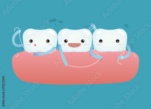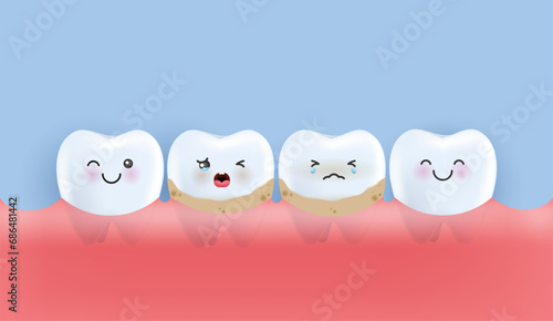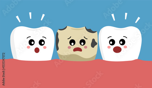 Growing up new tooth character looking at smiling white teeth, vector illustration. Children dentistry, dental health, oral hygiene.