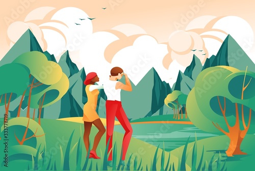 Guardian angel saving man hiker tourist from mad aggressive wild wolves in forest woodland vector illustration. Celestial safeguard protection from accident