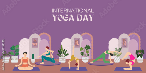Vector illustration of beautiful fitness girls doing step aerobics, exercising using step platforms, jump ropes. Gym girls concept flat style design.
