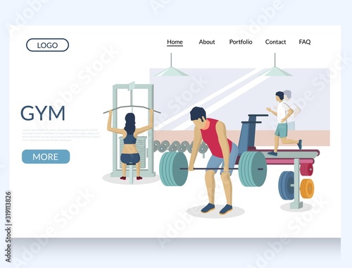Gym vector website template, web page and landing page design for website and mobile site development. Fitness training, cardio workout, powerlifting, weightlifting, bodybuilding, strength training.