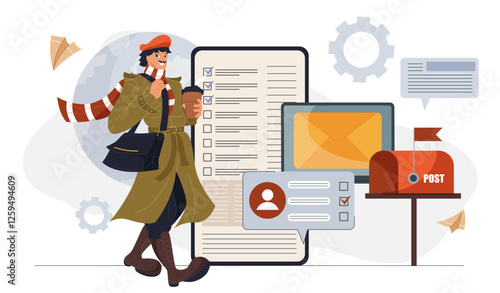 Cyber crime, hacker attack, vector flat illustration. Huge computer monitor with hacker characters stealing login password on screen, carrying credit card, bag with email messages. Phishing scam.