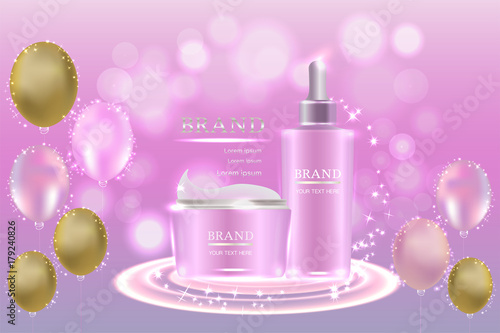 Hair conditioner ads vector paper cut illustration. Hair care product hair conditioner plastic bottle packaging mock up and beautiful woman with pink long wavy hair.
