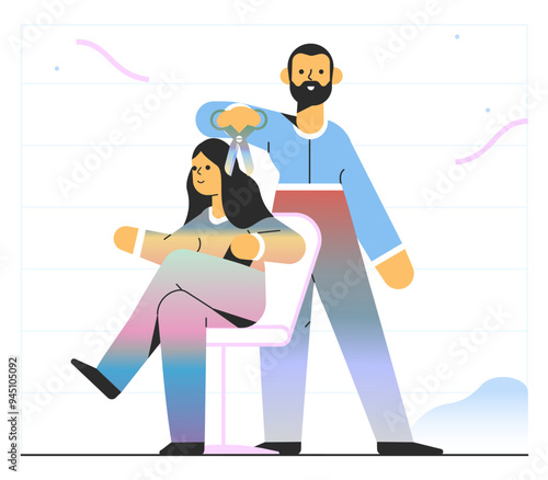 Huge woman head and micro male and female characters blow-drying her hair, vector illustration. Healthy hair, beauty salon services concept for web banner, website page etc.