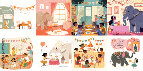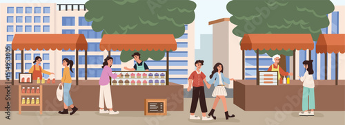 People celebrating Halloween, flat vector illustration. Family characters decorating home with bat garland, pumpkins, friends dancing in carnival costumes at Halloween party, kids trick or treating.