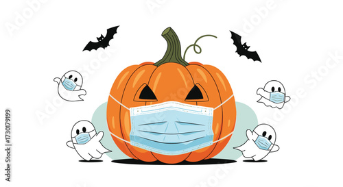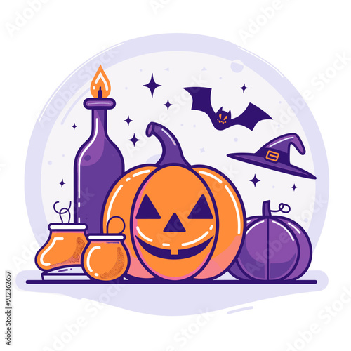 Happy Halloween pumpkin vector. Horror autumn party poster isometric illustration design. Creepy fall season event. 3d jack-o-lantern, bat, candle, eye decoration