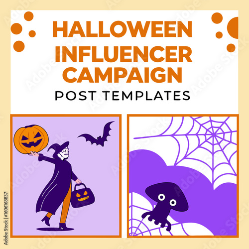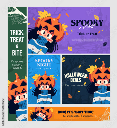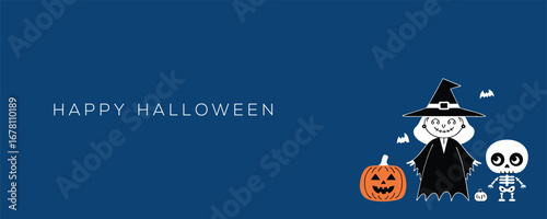 Halloween landing page template. Vector flat style design concept for Halloween website and mobile site development. Black spider, pumpkin, human skull, knife, bats, candy corns and witch hat.
