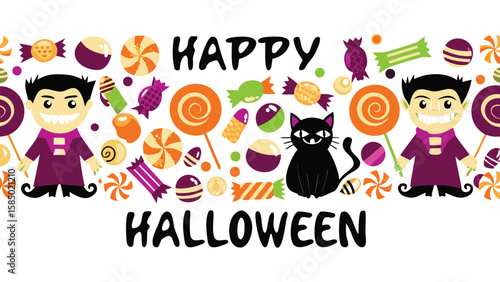 Halloween landing page template. Vector flat style design concept for Halloween website and mobile site development. Pumpkin, gravestone, skull, bats, candles, candy corns, maple leaves, black spider.