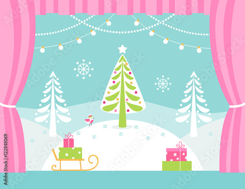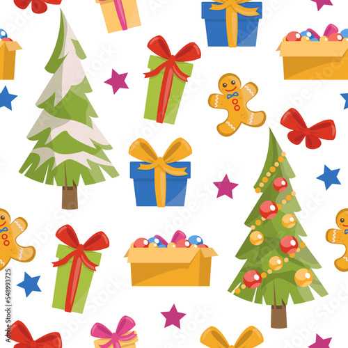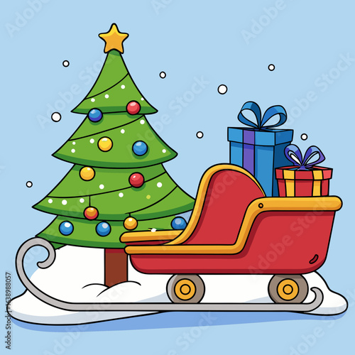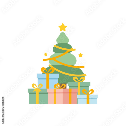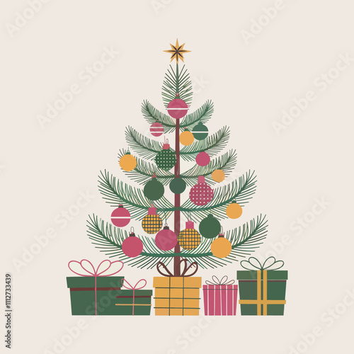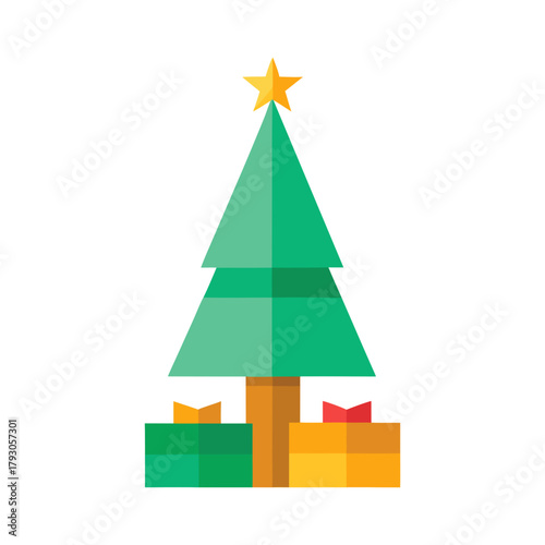 Handcraft origami Christmas tree decoration with present gift box vector illustration. Greeting card design template for Merry Xmas and Happy New Year invitation and congratulation