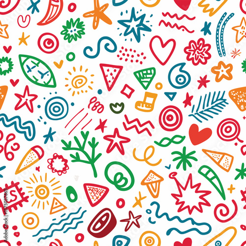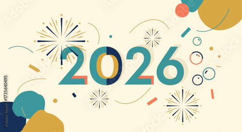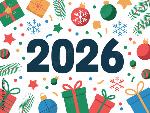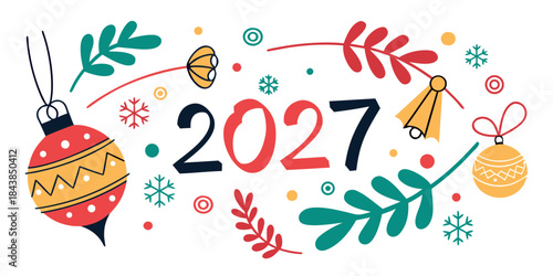 Happy 2024 new year greeting banner in trendy geometric minimal style. Festive fir tree baubles decorative Memphis design elements vector illustration