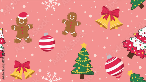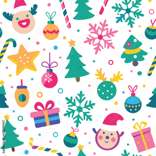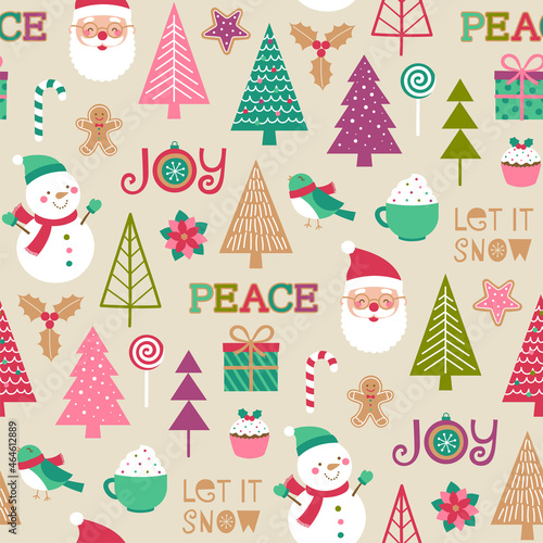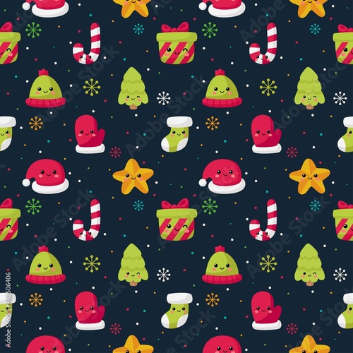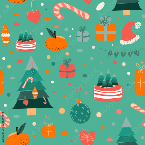 Vector seamless pattern with cute raccoon and panda wearing party hats and gift boxes, candies, cupcakes, party pennants around them. Happy birthday background, wallpaper, fabric, wrapping paper.