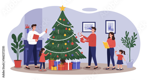Happy business people celebrating Merry Christmas and Happy New Year, vector flat illustration. New year bash, party with dj, Christmas tree. Male female characters giving gifts, dancing, having fun.