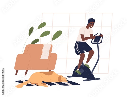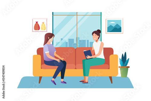 Happy couple celebrating housewarming party together after moving to new home, flat vector illustration. Living room interior with new furniture.