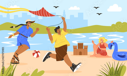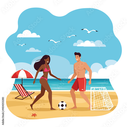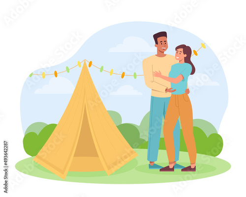 Happy loving young couple enjoying rest drinking cocktail travelling by cruise liner ship vector illustration. Holiday vacation and tourist trip concept