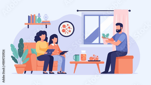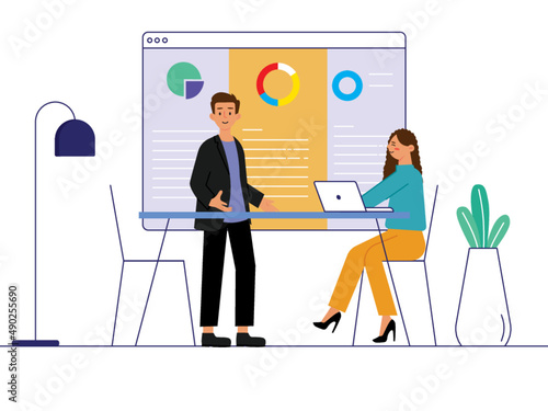 Happy couple hanging the lights on the window in hall room, flat vector illustration. Home decoration, home improvement.