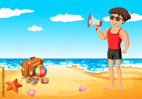 Happy couple taking selfie on beach, flat vector illustration. Summer vacation, beach holidays, romantic trip, traveling.