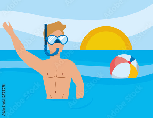 Happy couple taking selfie on beach, flat vector illustration. Summer vacation, beach holidays, romantic trip, traveling.