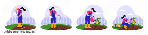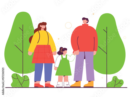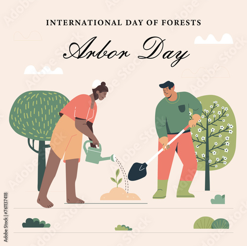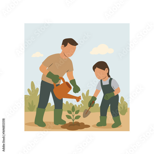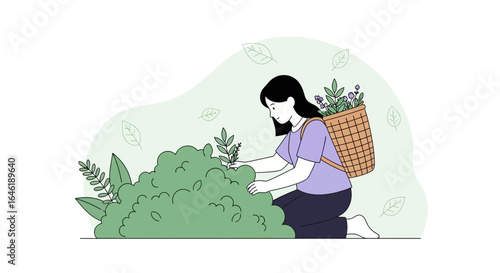 Happy couple walking in forest picking mushrooms, flat vector illustration. Mushroom hunting hobby. Summer and autumn season outdoor activity.