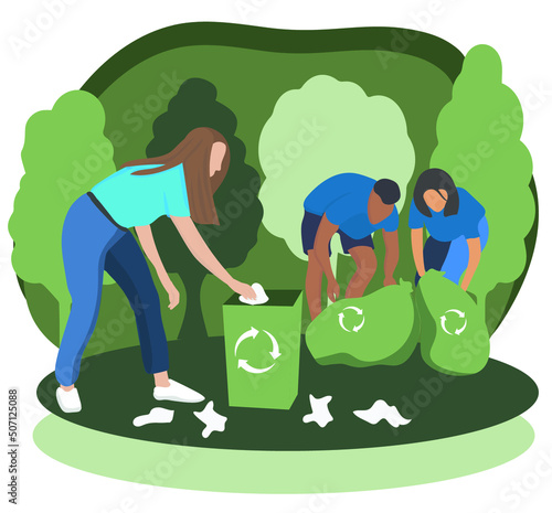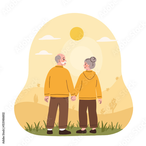Happy couple walking in forest picking mushrooms, flat vector illustration. Mushroom hunting hobby. Summer and autumn season outdoor activity.