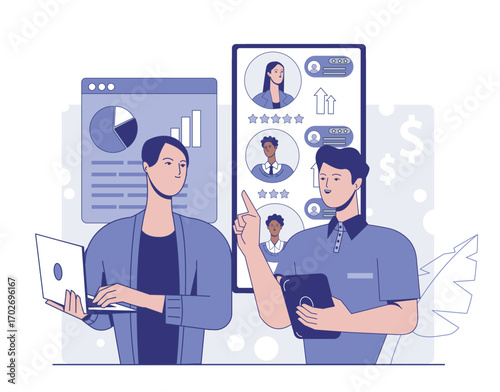 Happy couple with mobile phones and sms, chat bubbles, flat vector illustration. Man and woman chatting online, texting messages. Online communication.