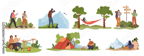 Happy couples having picnic, gathering mushrooms, hiking, sitting at fire in forest, vector flat isolated illustration. People camping, walking holding hands. Forest camp, summer outdoor activity.