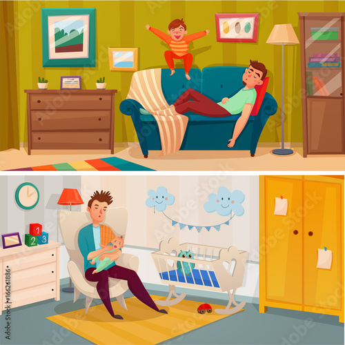 Happy father and daughter enjoying painting at home, flat vector illustration. Dad and kid having fun spending time together. Parent child relationship, fatherhood and parenting. Father day activity.