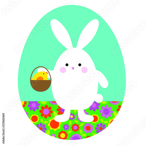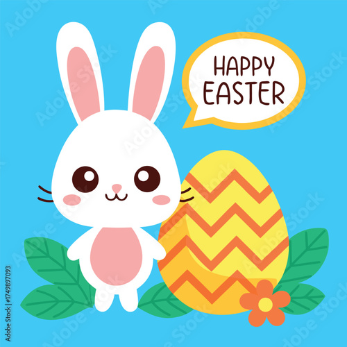 Easter bunny vector. Cute rabbit cartoon icon. Happy fluffy hare holding huge egg illustration isolated on white background. Animal character for spring holiday greeting card design