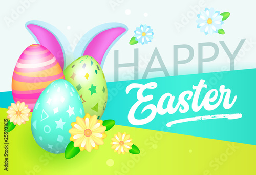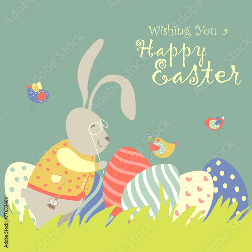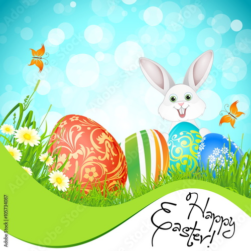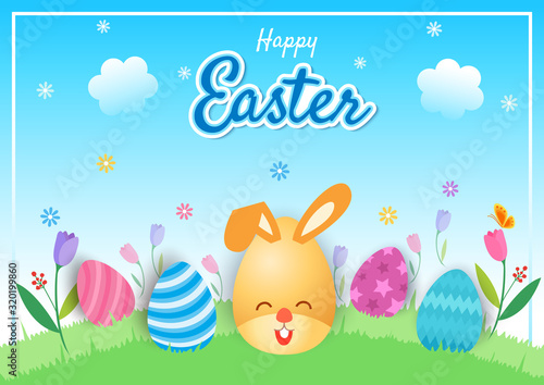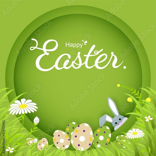 Happy Easter card with easter eggs and easter rabbit. Vector illustration in paper art style.